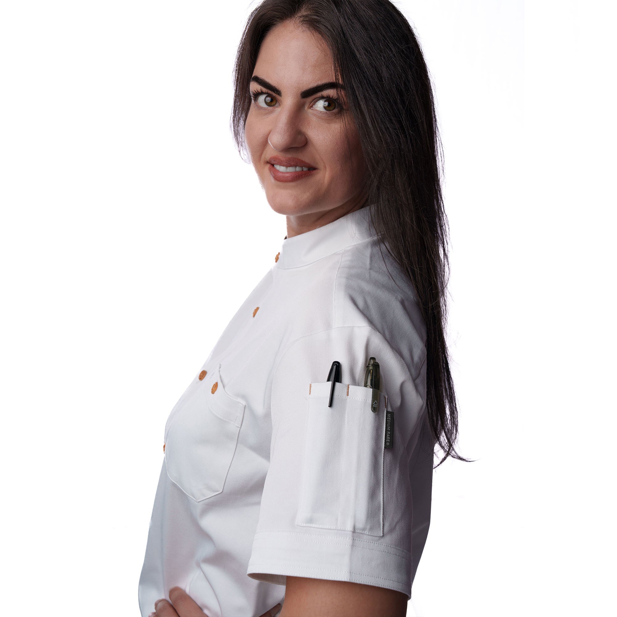 The Nord Jacket brings a sharp, modern edge to the kitchen with a crisp tailored fit, clean lines, and a refined band collar lined in tan to keep things looking fresh.  Smooth, bamboo-inspired buttons embossed with our Medium Rare mark bring just the right amount of detail, while performance stretch teflon-coated fabric and short sleeves keeps you moving and cool when the heat’s on.