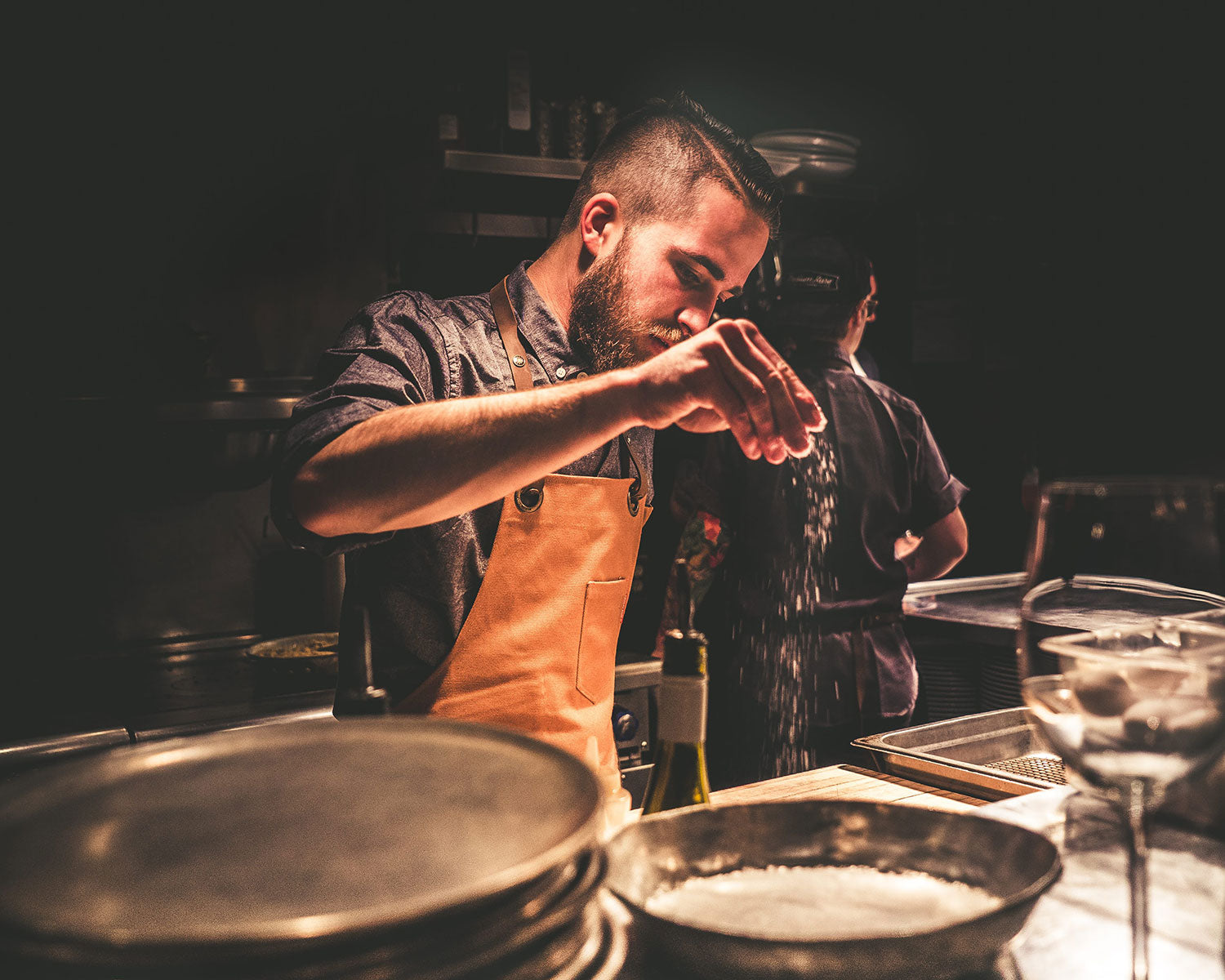Yes — we offer embroidery on any in-stock apron. No minimums, but reach out before ordering so we can get it right.